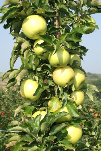 Der Säulenapfel 'Goldcats' besticht durch den hervorragenden Geschmack der knackig, saftigen Früchte. Das süßsäuerlicheAroma erinnert an die bekannte Sorte 'Golden Delicious'. Die großen, festfleischigen Äpfel sind goldgelb mit leicht rötlich angehauchter Seite. Sie sind ab September erntereif und lagerfähig. Durch die schlanke Säulenform eignet sich der (bot.) Malus 'Goldcats' besonders für kleinere Gärten, Terrassen oder Balkone. Ideale Voraussetzung für eine ertragreiche Ernte schafft ein durchlässiger, nährstoffreicher Boden und ein sonniger bis halbschattiger Standort. Eine zweite Apfelsorte sollte zur Befruchtung in der Nähe vom Säulenapfel 'Goldcats' stehen. Dafür sind andere Säulenäpfel Sorten gut geeignet, aber auch jede andere Apfelsorte kann verwendet werden.